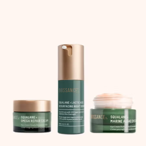 Wake up to dramatically smoother, more luminous skin with this powerful trio. Two full sizes, Marine Algae Eye Cream and 10% Lactic Acid Resurfacing Night Serum, combine to target fine lines and rough texture. Mini Omega Repair Cream deeply nourishes and strengthens skin's moisture barrier.