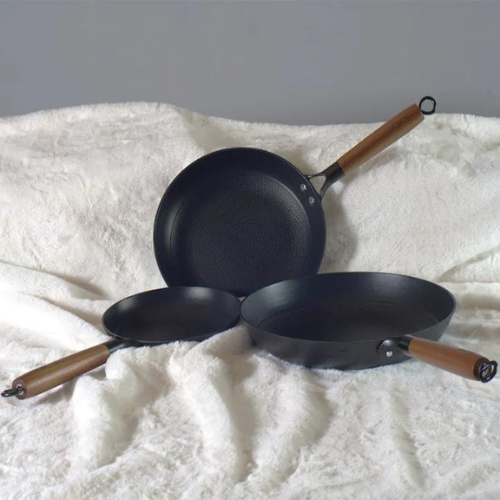 An indispensable frying pan set with ideal sizes for domestic use.