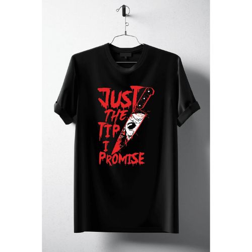already have an extensive collection of horror movie as becoming on you as this Just The Tip Horror T-Shirt! This hilarious tee is made with 100% soft ring-spun cotton, is lightweight and comfortable enough for everyday wear, and features a high quality print of a knife surrounded by bloody lettering, with the boogeyman Michael Myers himself in the reflection.