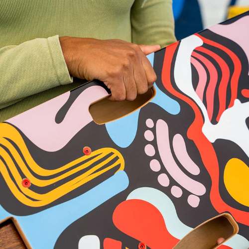 Dora Zeneth Reynosa is a Dallas muralist with deep roots in Mexico. Her Trippy Chair features cascading linework, rich color, and beautiful motifs from centuries of Azteca art. With its stow-and-go setup and radically comfy lean, this chair's ready for adventure wherever the music leads you.