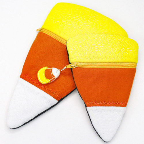 The Candy Corn Clutch is an adorable In-the-Hoop bag. On the front it showcases an exposed zipper with three Sulky Felty colors creating the look of the candy corn. The clutch is easy to construct all inside the hoop and fully lined with a small amount of hand stitching on the side. It comes in two sizes ready to stitch for either a 5"x7" or 6"x10" hoop along with a freestanding candy corn zipper charm created in a separate smaller hoop. Along the top and bottom seam are delicate decorative stitches with some glow in the dark stippling. The Felty gives the bag a nice amount of body but for more fluffiness as a layer of lightweight batting to the front. This bag whips up in no time and is ready to add your Halloween treats to it.