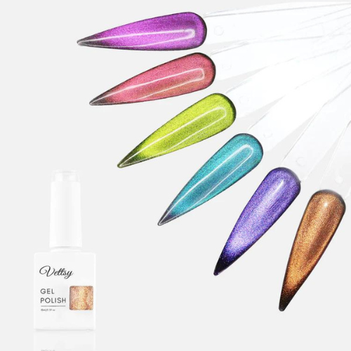 Vettsy new Cat Eye Gel Set-Spectrum includes 6 colors 9D magnetic gels for creating any kind of stunning cat eye effects. The special formulations of these chameleon cat eye gels can make your cat eye manicure look more three-dimensional and shiny. You will get different effects and colors under different lights and angles. These bold colors look so bright and dazzling. No matter in any season or any occasion, when you wear a nail design made with the spectrum cat eye gel, you will definitely earn endless praise. Suitable for natural nails, UV gel nails, false nails, acrylic nails, etc. Get them to give your nails a sophisticated and glamorous look!