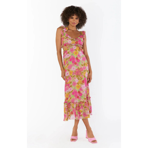 Be event ready in our Carnaby Floral Lane Midi Dress! Ruffled straps and v-neckline meet flirty side cutouts before ending at a ruffled midi hem. Head out in strappy heels and dainty jewelry for a best dressed guest look.