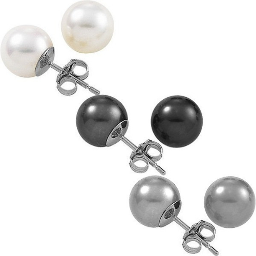 These white, black and grey 6mm-6.5mm (0.25-0.27 inches) round freshwater pearl earrings set are a great addition to any collection. The earrings come set upon genuine sterling silver posts.