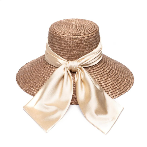 Bronze straw wide-brim sunhat with cream shiny satin ruched band and tails. This style features an adjustable grosgrain ribbon to achieve the wearer's desired fit. Storage & Care: This straw hat straw hat can be cleaned with a soft brush or lint roller. Store your hat in the box and stuff the crown with tissue paper so that the brim is supported, so that the weight of the hat does not distort the brim over time. Hats can also be hung on a hook or hat rack but turn them periodically to avoid the buildup of dust.