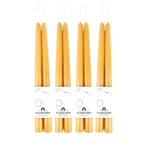 Our tapers are classic candles dipped into pure molten beeswax at just the right temperature by a steady hand and a keen eye. They are dipped and cooled over twenty times each before a pair can be cut free from the oak rack. When finished and hung, they carry the rich scent of honey and seem to hold light in their bellies. Kept out of drafts and away from fans these tapers will burn virtually dripless for about one hour per inch of length.