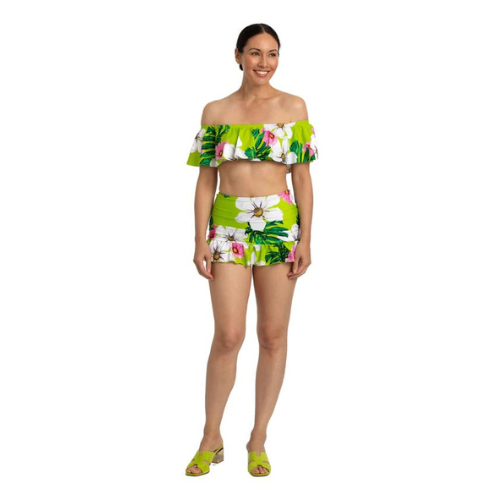 Already a favorite and still brand new to Tara Grinna is this sexy off the shoulder flounce bikini top. Tara Grinna's own unique and exclusively designed soft cup bra liner construction enables the top to fit a range of cup sizes from A-DD.
