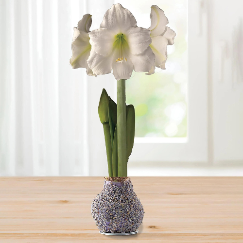 Plus, the bulb looks pretty even before it blooms thanks to the holiday colors and subtle design. Place it on any flat surface and the attached metal coil base will stabilize it. Or place it in a decorative container with moss, greenery, and other seasonal accents for a gorgeous centerpiece.
