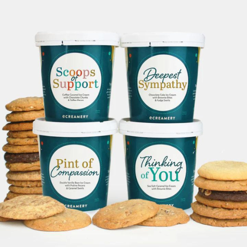 Four pints of delicious gourmet ice cream flavors, each named with a special Sympathy title, and 24 gourmet cookies. Each flavor is hand made with the finest specialty ingredients, sure to delight all ice cream and cookie lovers.