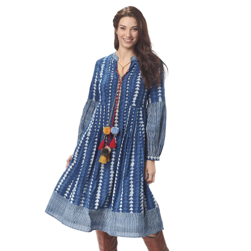 Boho Blues. A Bohemian fantasy in indigo batik, this exotically beautiful dress is embellished with attached colorful pompom and tassel-trimmed neck ties. Printed with an intriguing design, contrasting accents at the band collar, long lantern-shaped sleeves and hemline create a layered-look effect. Notched neckline and seamed waistline. 100% cotton. Hand washable. Imported. Sizes: S–XL; 45"–49" long. Item sizing runs large.
