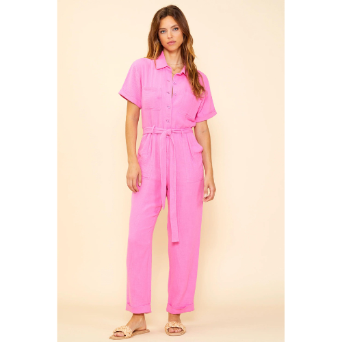 A lightweight, gauzy version of our favorite utility jumpsuit. Bright and eye-catching with a softly crinkled texture, it's cut for a straight-leg silhouette featuring cuffed short sleeves, patch pockets, and rolled hems. Leave some buttons undone and tie the belt to your liking. Add some strappy sandals or a fresh pair of sneakers—outfit, complete.