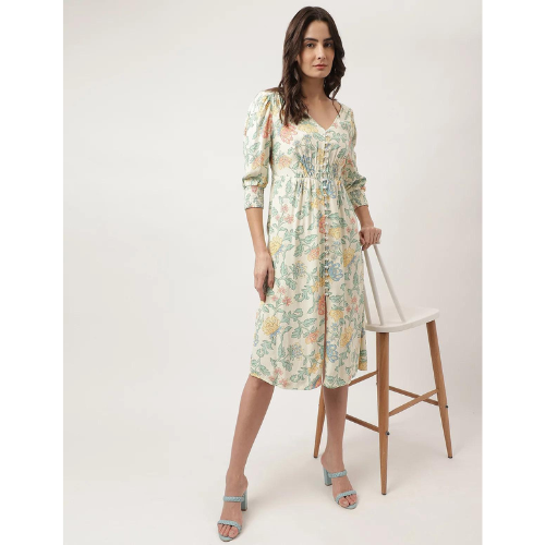 Introducing elegance in every detail: the Ivory Mix Printed V-Neck Dress at Marks & Spencer. With 3/4th sleeves and a regular fit, it effortlessly combines comfort and style. The intricate printed pattern adds a touch of sophistication, making this dress an exquisite choice for any occasion that demands a refined presence.