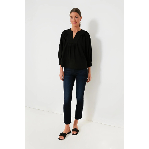 Simply chic, the Black Koa Blouse is a wardrobe staple. Elevated by its notched neckline and neatly pleated trim detailing, this blouse will take you from desk to drinks with effortless ease and style. With a relaxed fit that won't stick to you as the weather gets hot, we are pairing this outfit finisher with denim of all colors and neutral accessories for a chic and elevated daily style.