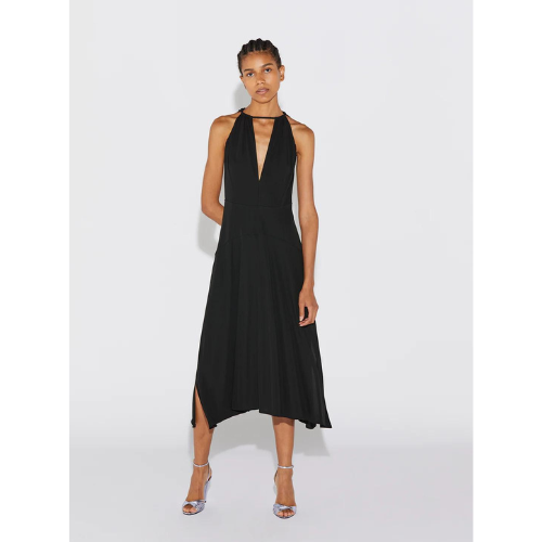 Introducing Cosima: A sleek, mid-length, matte jersey dress with a modern appeal. The halter neckline is adjustable, while the back remains strategically designed for coverage. The fitted bodice is shaped through the waist where it flares to create an a-line, asymmetrical sweeping skirt. Side seam slits expose the legs.