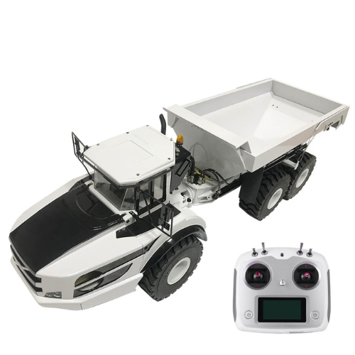 1/14 scale high simulation remote control hydraulic articulated truck dump truck model, made of high hardness alloy material, the surface of all metal simulation electrostatic spraying, exquisite workmanship. The cockpit is exquisite and stylish, with built-in figures, seats, steering wheel, left and right mirrors, shift levers, making the overall details more realistic.