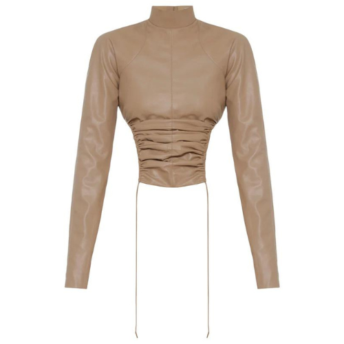 Defined by its ruched slim-fit design, Aleksandre Akhalkatsishvili gives blouses a much-needed upgrade this Fall '20 season. This iteration is crafted from faux leather fabric in a neutral beige hue with a mock neckline. For a complete set, team yours with the label's black cut-out trousers.