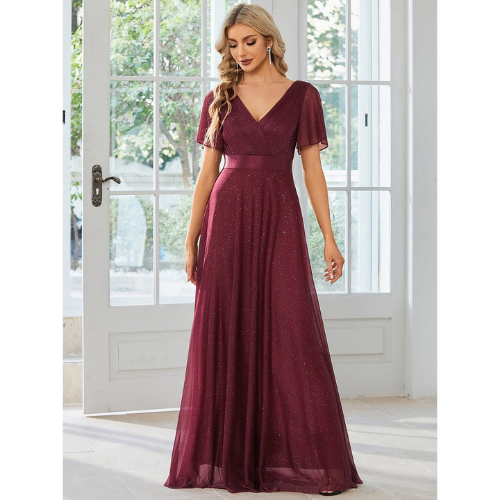 Shiny and sophisticated, indulge in this stunning A-line evening dress for your next special formal event. Short flutter sleeves and a plunging ruched v-neck exude elegance, along with a classic A-line silhouette. A luxe ribbon waist and sheer fabric overlay add a magical moment. Pair this floor-length evening dress with heels or flats and your favorite jewelry at evening party, prom or any special occasion.