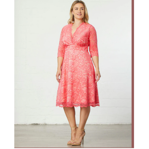Flatter your curves in our Mademoiselle Lace Cocktail Dress. This special occasion plus size A-line midi dress will have all eyes on you. With gorgeous scalloped lace and a classic fit and flare silhouette, you'll feel exquisite no matter the occasion, day or evening, formal or semi-formal. Perfect for the best dressed wedding guest, that bridesmaid who might just upstage the bride, as well as the beautiful mother of the bride or groom. Our reviewers have turned heads in the Mademoiselle at countless cocktail parties, formal and semi-formal events. This dress is now on sale and available exclusively in women's plus sizes (0x,1x,2x,3x,4x,5x, 12,14,16,18,20,22,24,26,28,30 and 32).