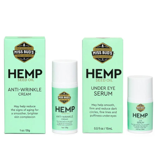 • Turn back time with the help of Miss Bud’s moisturizing Hemp Anti-Aging Duo! These top selling hemp infused skin care products go hand-in-hand to help combat dry skin, brighten under your eyes, & minimize the look of fine lines & wrinkles.