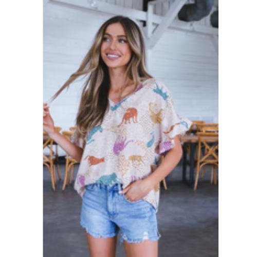 This Wild Things Cheetah Blouse features a unique cheetah pattern and ruffle sleeves, making it a great choice for those who want something stylish and bold. The cream multi hue adds a subtle pop of vibrancy. Enjoy the feel of this comfortable and lightweight blouse.