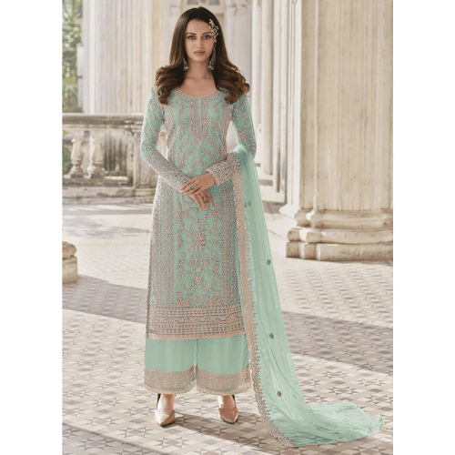 The Sky Blue Net Embroidered Palazzo Suit is a beautiful choice for festive wear, perfect for party occasions and Sangeet events in a wedding celebration. The soft and delicate sky blue color of the suit exudes a sense of freshness and radiance, making it an ideal option for a vibrant and joyful atmosphere.