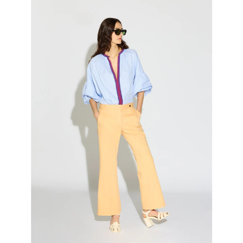 The Sofia is impeccably tailored in a beautiful shade of 70's vintage inspired peachy-orange in a mid-weight stretch twill for an effortless fit that is undeniably flattering. The Organic cotton twill fabric is garment dyed for a vintage touch and it is woven with stretch yarns which makes for a crisp look, but with a casual appeal and comfortable to wear.