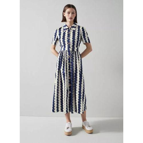 A shirt dress will forever be a favourite in our wardrobes, and we do love a crisp cotton summer version. The new Calder shirt dress takes on Matisse-inspired wavy stripes in navy and cream, and is a reimagined 1930's print. It has a pointed collar, gold buttons, a buckle belt and pleats at the waist falling to a midi-length skirt. Wear it with a pair of espadrilles and a raffia bag.