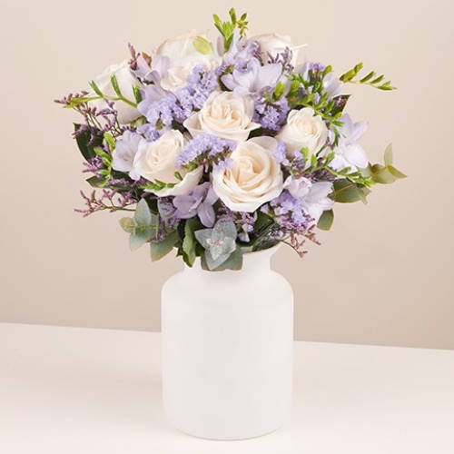 As soon as you see the Elegant Beauty bouquet, you’ll be reminded of tranquillity and pure love. The white roses make the perfect accompaniment to the purple flowers in the arrangement, especially the freesias and the limonium, which add an elegant yet wild touch. Surprise that special someone and make sure they know you’ll always be by their side. Ideal for… Telling someone you love them.