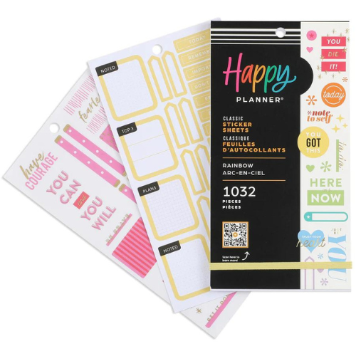 Just be you. This Value Pack Sticker Book has 30 sheets with 1032 stickers. Add these sticker packs to your Classic Happy Planner, guided journal, notebook, Memory Keeping Journal, or bullet journal to help you prioritize your tasks and decorate your spreads! Create spreads with all the colors of the rainbow, decorative trims, and memo boxes.