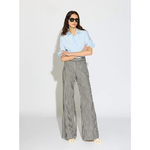 A Câllas signature pant. Dramatic, fit and flared A-line cut; long and leggy silhouette. Black cotton twill is woven with Natural colored stripes. The fabric is crisp yet fluid with a forgiving fit. Patch pockets and a yoke detail give this pant a slightly 70s jeans vibe; the gold-tone medallion at the waistband takes things up a notch. Order true to size for a fit and flare look, or go one size bigger for a slouchier effect.
