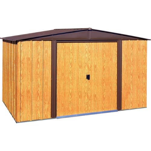 Get the perfect steel outdoor shed in a stylish woodgrain finish! If you're looking for a practical steel shed that will last season after season, and won't be an eyesore in your backyard, look no further than the Woodlake 10 x 12 ft. steel shed from Arrow Sheds. This attractive steel shed comes with pre-drilled and pre-cut parts which will cut down on the assembly time of your outdoor building. Its more compact size makes it a more practical solution for storing items like your lawn mower and other lawn equipment, or garden equipment like rakes, seeds and much more.