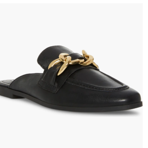 Gleaming chain-link hardware enriches the vamp of a sophisticated mule fashioned with a squared moc toe for contemporary appeal.