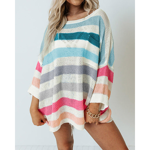 Save More On Great Deals ELFSHE Batwing Sleeve Oversized Pocket Striped Knit Top