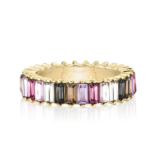 An array of rich seasonal hued crystals in gold plating make for the perfect wear everyday ring - stack these multicolor baguette rings for more sparkle!