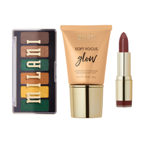 Money Saving Bestie eyeshadow palette, Soft Focus Glow Complexion Enhancer & a Color Statement Lipstick – everything you need for a bronzed jewel-toned look. Each eyeshadow shade was co-created with Rocio to come up with the perfect range of golden neutrals & pops of emerald, making this palette versatile & ultra-wearable for holiday & beyond.