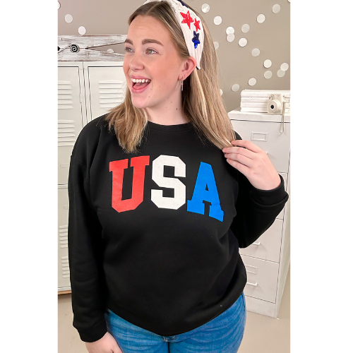• Graphic sweatshirt design features USA in collegiate block lettering printed in red, white and blue ink with a white undertone. This trendy top is the perfect for all Patriotic holidays. Memorial Day, 4th of July, or Labor Day!