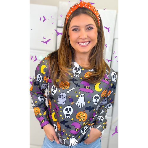 • Halloween sweatshirt design features various Halloween icons throughout the entire top. Icons include ghosts, Jack o' lanterns, bats, candy and more. This trendy top is perfect every Halloween event!