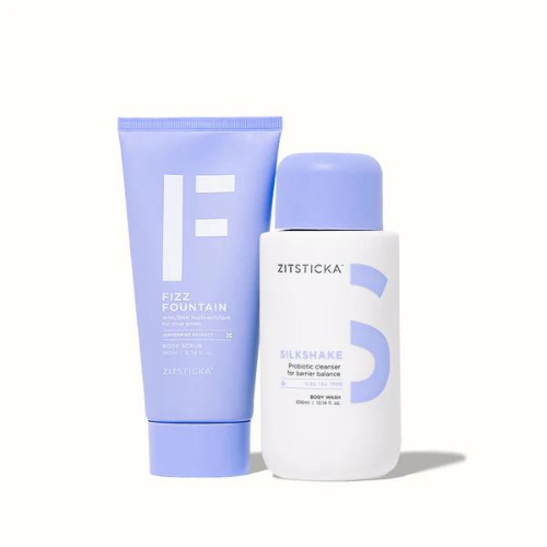Soothe existing breakouts with SILKSHAKE. It's a mix-up of pre, post and probiotics, this nutrient-dense body cleanser balances your skin's microbiome to keep nice drama in and mean ones out. Omegas 3, 6 + 9 strengthen your skin barrier, while tea tree + niacinamide soothe skin issues. To prevent future breakouts from forming, follow up with FIZZ FOUNTAIN. It's a hybrid of chemical and physical exfoliants, this supercharged body scrub refines, retexturizes and dives deep into pores to scoop out dirt + debris. A smoothing exfoliator that keeps skin troubles *off your back* (and whole body!).