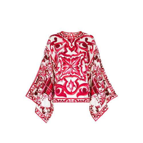 This Dolce & Gabbana blouse features the brand's Majolica print on a white background. This tunic top has a high neck and flowing sleeves. Pair it with the matching shorts for an easy summer look.
