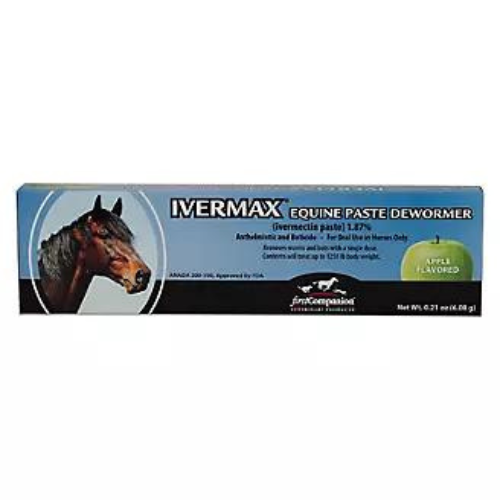 An effective, broad-spectrum paste that helps to control and kill internal parasites, including bots and the arterial stages of Strongylus vulgaris, with a single dose. Ivermax Equine Paste contains ivermectin 1.87% anthelmintic and boticide. Apple flavored for palatability.