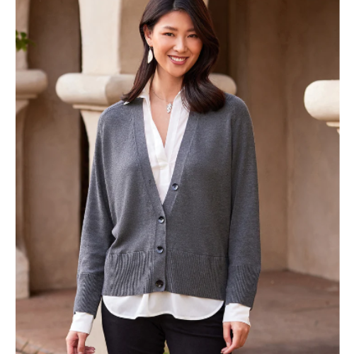 The ultimate cardigan: wear it dressed-up or-down any day of the week. A peek of a white shirt at the collar and hem give the illusion that this one-piece topper may actually be two. Also features contrast rib detailing for a finely finished look.