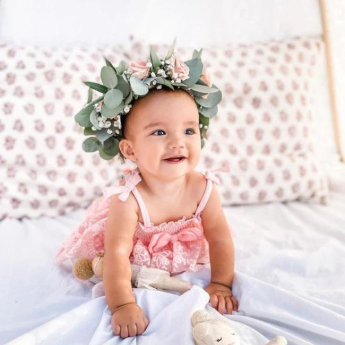• Knit romper is sleeveless with self fabric straps, shirring at bodice, elastic leg opening, snap crotch opening, 2 layers of dtm lace and chiffon bow at front.