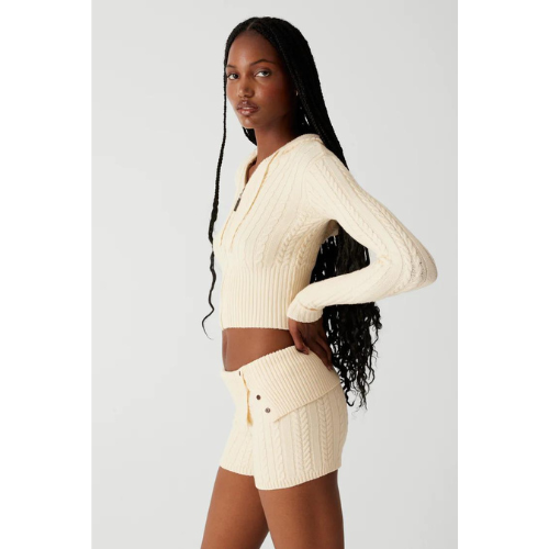 Your bikers have some major competition. This fitted-but-relaxed mini short is made from cable cloud knit fabric, with a short below-the-booty cut, a fold over waistband with natural bamboo buttons, and ribbed details for added flair. Wear the Nolan mini short with the matching Aimee hoodie as the knit set of your dreams.