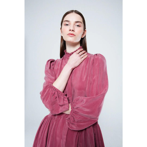 • Puff sleeves, mini ruffled collar, wide-cut and asymmetric, midi, cupro (vegan silk) dress. Perfect match  to look elegant while still feeling comfortable. It can be paired with sneakers for a more casual look, or with a belt and high heels for a more formal look. Details include a mini-ruffed collar and puff sleeves. Sustainably made in İstanbul.
