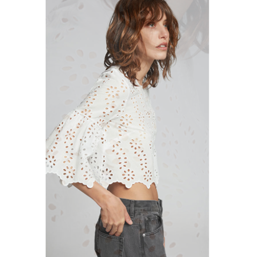 Broderie anglaise flared blouse crafted from cotton. Featuring delicate allover embroidered detail and flared quarter-length sleeves, a round-cut neckline and softly scalloped edges. Secured with a buttoned back and cut in a regular length, flared silhouette.