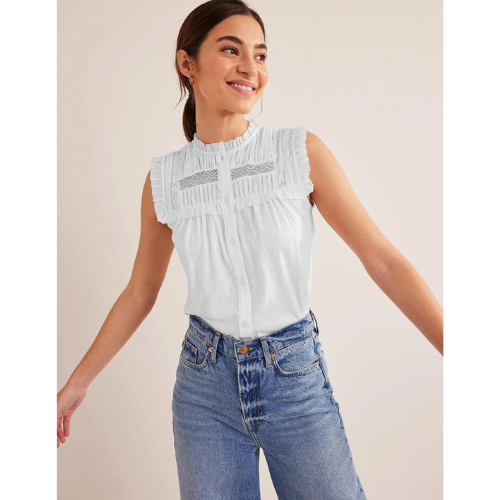 Cut from lightweight slubbed cotton and modal-blend jersey, this sleeveless shirt is an effortless choice. The ruffled lace yoke and trims take